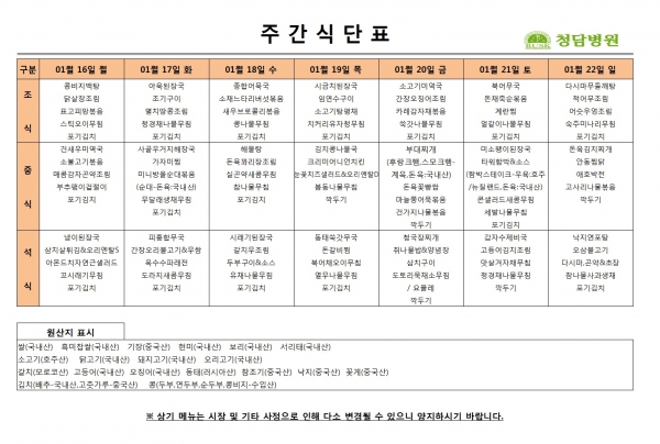 01/16 ~ 01/22 주간식단표